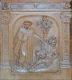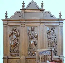 Les panneaux en bas-reliefs et les groupes en ronde bosse qui les couronnent représentent des scènes bibliques. Le style renaissance marque un retour à l'art antique, grec ou romain. On trouve un foisonnement de rinceaux et d'éléments végétaux.