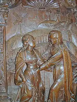 Ce panneau présente la rencontre de deux femmes enceintes. Celle de droite est Elisabeth, cousine de Marie, qui va donner naissance à Jean-Baptiste. Marie, venue à la rencontre de sa cousine, porte Jésus. Elle pose sa main sur le ventre d'Elisabeth. L'arrière-plan est un paysage, avec une petite ville fortifiée et un moulin à vent. Est-ce une évocation de la campagne montréalaise ? |