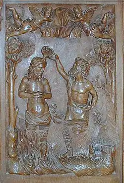 Le Jourdain coule aux pieds de Jésus, tandis que son cousin Jean-Baptiste verse sur sa tête l'eau du baptême. Aux dessus de leurs têtes volent des anges. |
