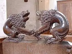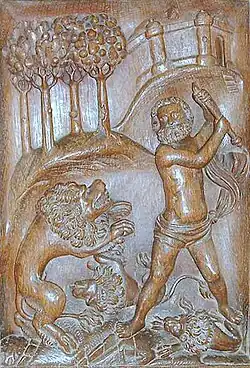 Un homme barbu terrasse des lions. Certains y voient une évocation biblique : David ou Samson combattant un lion. Peut-être le lion est-il une figure du mal ? |