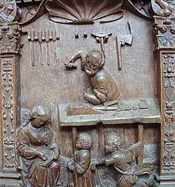 Nous retrouvons Jésus enfant dans l'atelier de son père, occupé à travailler le bois. Derrière lui se trouvent ses outils : ciseaux, gouge, hachette. Marie, assise, est en train de coudre. Jésus, devant l'établi, est dans un chariot à roulette poussé par un ange. |