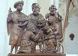 Les rois mages, richement vêtus à la mode orientale du XVIe siècle, viennent déposer leurs offrandes aux pieds de l'enfant-Jésus. |