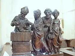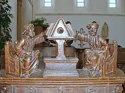 Cette œuvre du XVIe siècle, située dans le chœur, représente le Christ entouré de la Vierge et de saint Pierre. Jésus tient dans sa main le globe terrestre surmonté d'une croix. Marie porte l'enfant Jésus. |