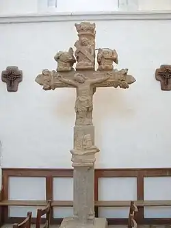 Cette croix du XIVe siècle a été retrouvée en 1943, enterrée dans le cimetière. Elle a été placée dans le transept sud (à droite quand on regarde le chœur). Elle montre le Christ crucifié, surmonté par deux anges qui portent le soleil et la lune. Sur l'autre côté, on voit la Vierge, couronnée par un ange. La croix est décorée de nombreuses fleurs et d'évocations de pierreries. |