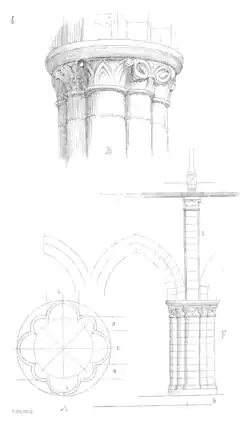 - ↑ Le style des chapiteaux et la structure des colonnes est rattaché aux traditions angevines par certains auteurs.