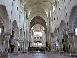 — La longueur totale dans l'œuvre de l'édifice est de 65 m. La largeur atteint 20 m au niveau du transept, et la hauteur du vaisseau est de 15 m[19]. L'ensemble oriental, y compris le déambulatoire, est légèrement plus long que la nef, ce qui est une caractéristique fréquente des églises ecclésiastiques. Les travées de la nef sont recouvertes deux par deux par trois voûtes sexpartites, et les quatre premières travées du chœur également. La dernière travée a été pareillement pourvue d'une voûte sexpartite, mais dans un sens perpendiculaire à l'axe de l'édifice, de sorte qu'une branche d'ogives retombe au milieu du chevet : cette disposition concorde avec la subdivision en deux grandes arcades du premier niveau d'élévation. Les bas-côtés et le déambulatoire sont recouverts par des voûtes sur croisées d'ogives simples. L'ensemble du vaisseau central présente une élévation sur trois niveaux: grandes arcades au rez-de-chaussée, étage intermédiaire percé de petites baies rectangulaires ouvrant sur les combles des bas-côtés, dernier niveau éclairé par des fenêtres hautes. L'église ne possède que deux accès : le portail occidental de la nef et le portail occidental du bas-côté sud.