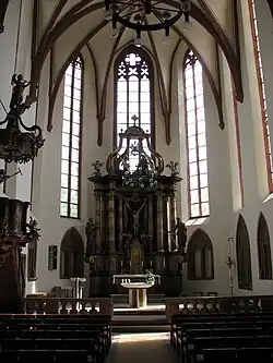 La partie église catholique de Sainte-Julienne se compose de l'ancien chœur gothique étendu de l'ouest par des chapelles latérales. Celui-ci est subdivisé en quatre travées auxquelles une voûte croisée est adjacente à l'est. La chœur abrite un autel baroque de 1732, ainsi que la pierre tombale de la comtesse palatine Johanna von Beieren-Landshut, épouse d'Otto Ier de Palatinat-Mosbach. Les autres trésors artistiques de la partie catholique comprennent également une chaire richement décorée, des autels baroques et des bijoux historiques dans les chapelles latérales.