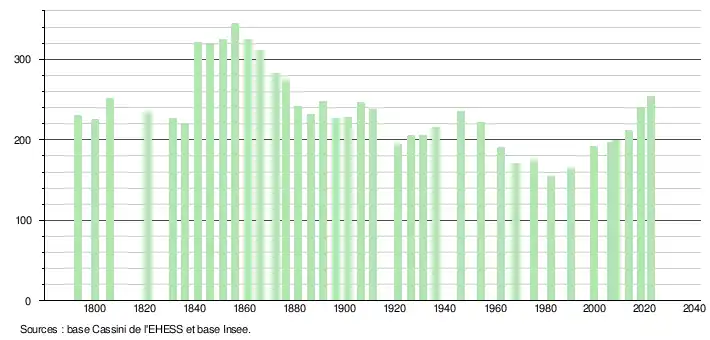L'évolution du nombre d'habitants est connue à travers les recensements de la population effectués dans la commune depuis 1793. Pour les communes de moins de 10 000 habitants, une enquête de recensement portant sur toute la population est réalisée tous les cinq ans, les populations de référence des années intermédiaires étant quant à elles estimées par interpolation ou extrapolation[28]. Pour la commune, le premier recensement exhaustif entrant dans le cadre du nouveau dispositif a été réalisé en 2008[29].