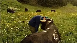 Le jeune vacher Fabrice monte pour la première fois à l'alpage avec un troupeau de vaches d'Hérens pour le traditionnel combat de reines.