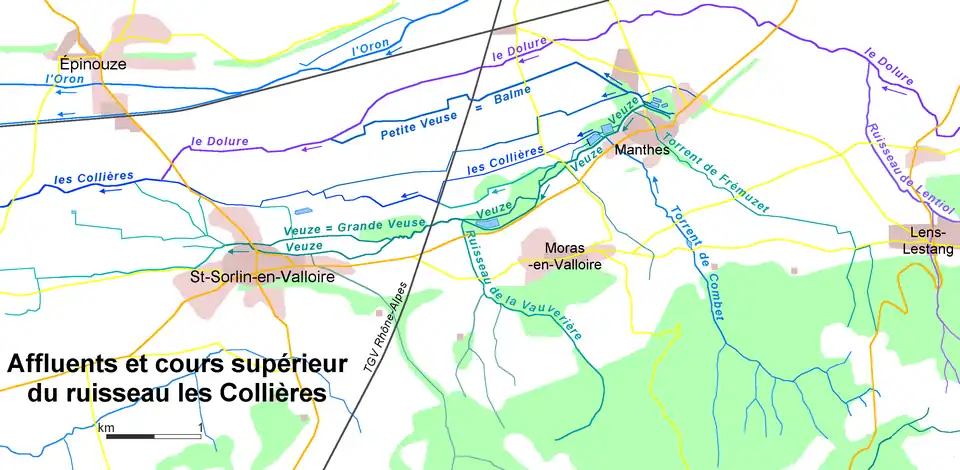 • La Grande Veuse (SANDRE V3430540[2], IGN: Veuze) (rg[note 1]) 8,7 km sur les quatre communes de Manthes, Anneyron, Saint-Sorlin-en-Valloire et Moras-en-Valloire. Par ce que La Grande Veuse croise le cours de Torrent de Combet - les Collières à la limite de Manthes et Moras, là les deux cours font même une confluence et une bifurcation. Plus bas branches d'irrigation de la Veuze sont affluents des Collières. La Veuze a :