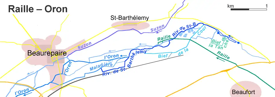 • un cours supérieur (ou affluent premier à la limite de Beaufort et Saint-Barthélemy) de 35 km (SANDRE V34-0400[9]) au nom de Rival (partie supérieure) ou Raille (partie inférieure)