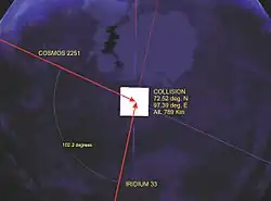 La collision entre les satellites Iridium-33 et Kosmos-2251 a eu lieu le à 16 h 56 TU[1] à 776 kilomètres au-dessus de la péninsule de Taïmyr en Sibérie. Cette collision impliquait le satellite commercial Iridium 33 (560 kg), de l'entreprise Iridium spécialisée dans la téléphonie par satellite, et le satellite Kosmos-2251 (900 kg), un satellite de télécommunications militaires russe de type Strela-2M retiré du service. C'est le premier événement répertorié de ce type.