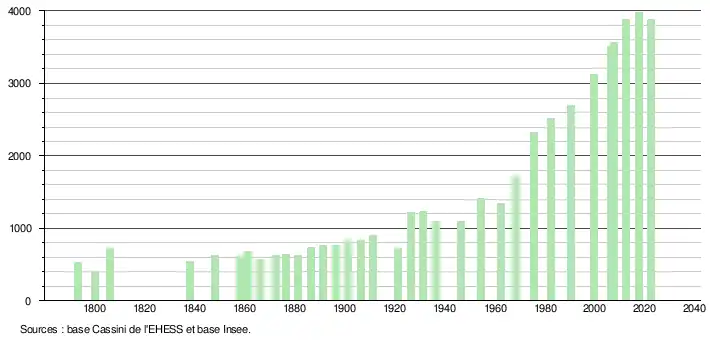 L'évolution du nombre d'habitants est connue à travers les recensements de la population effectués dans la commune depuis 1793. Pour les communes de moins de 10 000 habitants, une enquête de recensement portant sur toute la population est réalisée tous les cinq ans, les populations de référence des années intermédiaires étant quant à elles estimées par interpolation ou extrapolation[20]. Pour la commune, le premier recensement exhaustif entrant dans le cadre du nouveau dispositif a été réalisé en 2007[21].