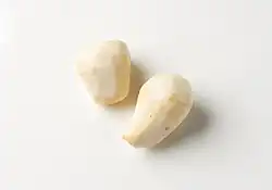 Celles-ci, de forme ovoïde à ellipsoïde, striées longitudinalement, mesurent 1,0 à 1,5 mm de long sur 0,7 à 1,0 mm de diamètre. Elles sont dures, de couleur jaune paille ou jaune clair, présentent un hile bien visible à une extrémité et un délicat funicule translucide, et sont pourvues d'un albumen abondant[4],[7].