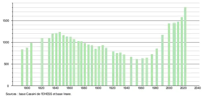 L'évolution du nombre d'habitants est connue à travers les recensements de la population effectués dans la commune depuis 1793. Pour les communes de moins de 10 000 habitants, une enquête de recensement portant sur toute la population est réalisée tous les cinq ans, les populations de référence des années intermédiaires étant quant à elles estimées par interpolation ou extrapolation[19]. Pour la commune, le premier recensement exhaustif entrant dans le cadre du nouveau dispositif a été réalisé en 2007[20].