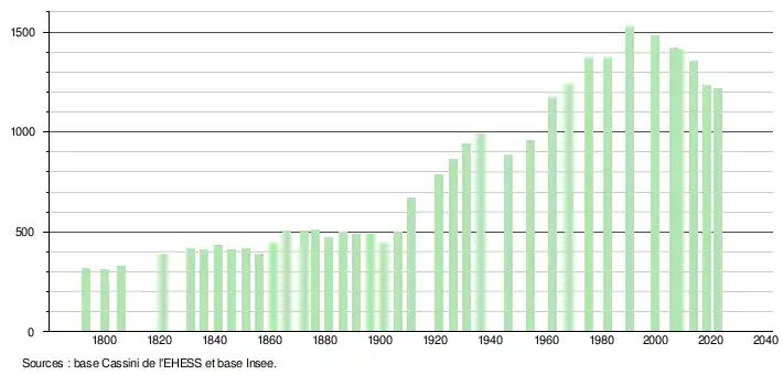 L'évolution du nombre d'habitants est connue à travers les recensements de la population effectués dans la commune depuis 1793. Pour les communes de moins de 10 000 habitants, une enquête de recensement portant sur toute la population est réalisée tous les cinq ans, les populations de référence des années intermédiaires étant quant à elles estimées par interpolation ou extrapolation[21]. Pour la commune, le premier recensement exhaustif entrant dans le cadre du nouveau dispositif a été réalisé en 2008[22].