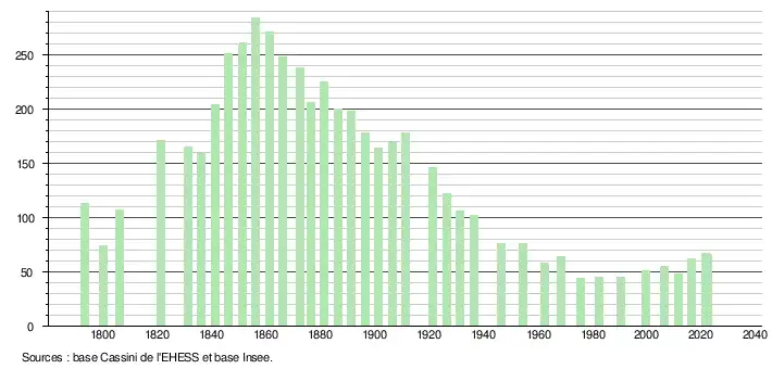 L'évolution du nombre d'habitants est connue à travers les recensements de la population effectués dans la commune depuis 1793. Pour les communes de moins de 10 000 habitants, une enquête de recensement portant sur toute la population est réalisée tous les cinq ans, les populations de référence des années intermédiaires étant quant à elles estimées par interpolation ou extrapolation[12]. Pour la commune, le premier recensement exhaustif entrant dans le cadre du nouveau dispositif a été réalisé en 2006[13].