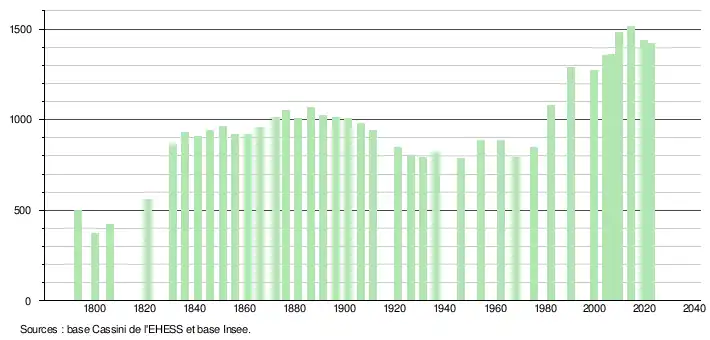 L'évolution du nombre d'habitants est connue à travers les recensements de la population effectués dans la commune depuis 1793. Pour les communes de moins de 10 000 habitants, une enquête de recensement portant sur toute la population est réalisée tous les cinq ans, les populations de référence des années intermédiaires étant quant à elles estimées par interpolation ou extrapolation[26]. Pour la commune, le premier recensement exhaustif entrant dans le cadre du nouveau dispositif a été réalisé en 2004[27].