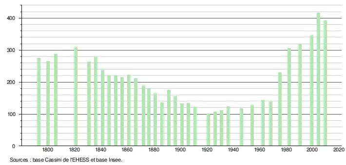- ↑ Dans le tableau des recensements et le graphique, par convention dans Wikipédia, le principe a été retenu, pour les populations légales postérieures à 1999 de n’afficher dans le tableau des recensements et le graphique que les populations correspondant à l'année 2006, première population légale publiée calculée conformément aux concepts définis dans le décret no 2003-485 du 5 juin 2003, et les années correspondant à une enquête exhaustive de recensement pour les communes de moins de 10 000 habitants, ainsi que la dernière population légale publiée par l’Insee.