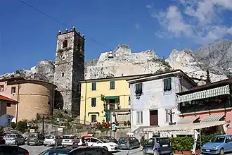 Sur la placette, à côté de l'église se trouve le Monumento al cavatore (Monument au carrier), œuvre d'Alberto Sparapani de 1983, long de 11 mètres et d'un poids de 60 tonnes, entièrement en marbre et caractérisé par un bas-relief sculpté qui raconte l'histoire du travail du marbre par les carriers.