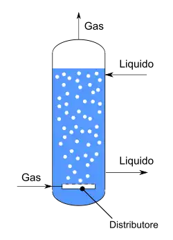Son nom dérive du fait que la phase gazeuse est insufflée dans la partie inférieure de la colonne et remonte à travers le liquide sous forme de bulles. À la surface de ces bulles a lieu la rencontre de la phase gazeuse et de la phase liquide, qui échangent des substances ou réagissent pour former de nouvelles substances. La surface totale des bulles dans une colonne à bulles oscille typiquement autour de 1 et 200 m2 par m3 de liquide[1].