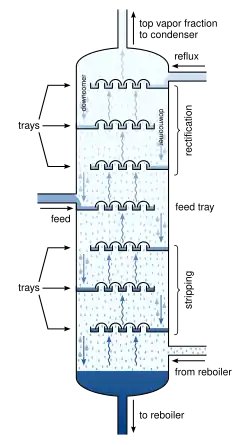 Le liquide est recueilli au fond de la colonne et subit une évaporation grâce à un rebouilleur, tandis que le gaz est recueilli vers le haut et subit une condensation grâce à un condenseur. Le liquide et le gaz produits en haut et en bas sont en général recirculés.