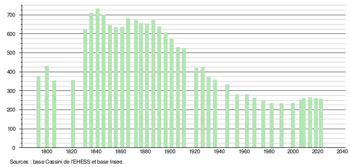 L'évolution du nombre d'habitants est connue à travers les recensements de la population effectués dans la commune depuis 1793. Pour les communes de moins de 10 000 habitants, une enquête de recensement portant sur toute la population est réalisée tous les cinq ans, les populations de référence des années intermédiaires étant quant à elles estimées par interpolation ou extrapolation[14]. Pour la commune, le premier recensement exhaustif entrant dans le cadre du nouveau dispositif a été réalisé en 2008[15].