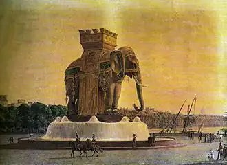 Sous l'Empire, on projeta d'agrémenter la place d'une grande fontaine, alimentée par le canal de l'Ourcq au cœur des grands travaux entrepris alors pour alimenter Paris en eau potable. On imagina alors au-dessus de la fontaine une sculpture d'éléphant militaire à l'antique en bronze. L'éléphant devait mesurer 16 mètres de long, 15 mètres de haut (24 mètres sur le socle de la fontaine). La première pierre du socle fut posée le , par le ministre de l'Intérieur, pour célébrer le quatrième anniversaire du sacre de Napoléon Ier. Un escalier en vis devait permettre de remonter à l'intérieur de l'animal pour accéder à une plateforme d'observation aménagée en haut de sa tour. Jean-Antoine Alavoine reprit le travail de l'architecte Jacques Cellerier et planta le soubassement de la fontaine, qui est la base actuelle de la colonne de Juillet. Il dressa au sud de la place une maquette grandeur nature, en bois et en plâtre, qui subsista jusqu'en 1846.