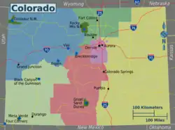 Le Colorado (en anglais : /kɑləˈɹædoʊ/ [2],[3]) est un État des montagnes de l'Ouest américain. Sa capitale est Denver, qui forme avec Aurora une métropole de 3 214 218 habitants, soit plus de la moitié de la population de l'État[4],[5]. Le Colorado est surnommé l'« État du centenaire » (the Centennial State) car il a intégré l'Union en 1876, 100 ans après la déclaration d'indépendance des États-Unis. Avec 14,5 % d'augmentation entre 2010 et 2019, le Colorado fait partie des États connaissant la plus forte croissance démographique[6].