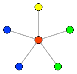 Le graphe étoile K1,5 de la figure ci-contre est un graphe biparti complet, et pourrait par conséquent être coloré avec seulement deux couleurs : une pour le centre, et l'autre pour la périphérie. Néanmoins, une des couleurs ne s'appliquerait qu'à un seul sommet tandis que l'autre en concernerait cinq : la répartition des couleurs ne serait pas équitable.