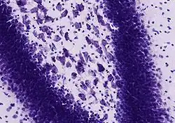 La coloration de Nissl consiste à imprégner des tranches du tissu d'un colorant tel que le violet de crézyl (en), le bleu de méthylène ou la thionine. Ceux-ci se lient à des substances basophiles comme l'ARN ou l'ADN ce qui donne une coloration bleu ou violette du noyau et des ribosomes. S'agissant des neurones, ces organites ne sont présentes que dans le péricaryon, et non dans les neurites (axone ou dendrites), si bien que seul le corps cellulaire (soma) est coloré. Par ailleurs, la sensibilité du violet de crésyl permet de différencier les éléments cellulaires des neurones (par exemple, les nucléoles du noyau) en fonction de leur acidité[1].