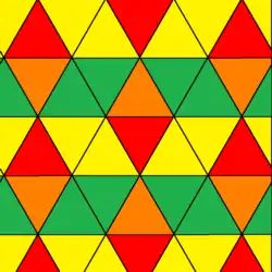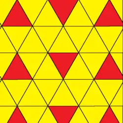 Par exemple, la coloration archimédienne d'un pavage triangulaire utilise deux couleurs (à gauche). Elle nécessite 4 couleurs pour devenir une coloration 2-uniforme (à droite) :