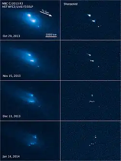 Photos du télescope Hubble : L'astéroïde P/2013 R3 situé dans la ceinture principale s'est désintégré sous l'influence de la force centrifuge. Les 13 fragments présentent une morphologie et une activité cométaire[2].