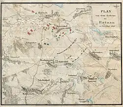 Le 26 mai, la division Maison traverse Haynau lorsqu'elle est attaquée à la sortie de la ville par l'artillerie prussienne[1]. Le colonel von Dolffs, commandant en chef la réserve de cavalerie de Blücher, charge alors les Français avec 3 000 cavaliers. Complètement surpris, le bataillon de tête est enfoncé avant de pouvoir se former en carré ; il est rejeté sur les bataillons qui suivent et y sème la panique[2]. La cavalerie prussienne malmène les fantassins de Maison jusqu'à ce que la division du général Puthod arrive à la rescousse et rallie les fuyards[1]. Reformée, l'infanterie française parvient à repousser les assaillants qui se retirent, laissant derrière eux le corps du colonel von Dolffs, tué au cours de l'action[1].