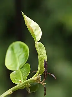 - La feuille de combava (parfois feuille de citron kaffir) est un condiment usuel dans la cuisine de l'Asie méridionale, et du sud de l'océan Indien, dont les Mascareignes, aux Philippines, en Indonésie, en Malaisie, en Thaïlande, au Cambodge, au Viêt Nam, etc.[47],[25]. Depuis la décennie 2010, son utilisation est devenue fréquente en Grande-Bretagne sous l'influence du green curry du chef Jamie Oliver largement médiatisé, et de par le monde chez les restaurants thaïlandais[48].