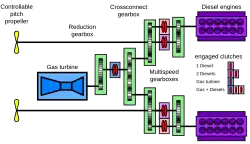 Un tel système de propulsion a un encombrement plus réduit qu’un moteur diesel seul pour la même puissance maximale, car des moteurs diesels plus petits peuvent être utilisés, et la turbine à gaz et la boîte de vitesses n’ont pas besoin de beaucoup d’espace supplémentaire. Néanmoins, il conserve le rendement énergétique élevé des moteurs diesel en croisière, ce qui permet une plus grande autonomie et des coûts en carburant inférieurs à ceux des turbines à gaz seules. D’autre part, un engrenage plus complexe, lourd et gênant est nécessaire.
