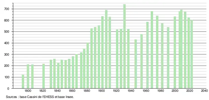 L'évolution du nombre d'habitants est connue à travers les recensements de la population effectués dans la commune depuis 1793. Pour les communes de moins de 10 000 habitants, une enquête de recensement portant sur toute la population est réalisée tous les cinq ans, les populations de référence des années intermédiaires étant quant à elles estimées par interpolation ou extrapolation[12]. Pour la commune, le premier recensement exhaustif entrant dans le cadre du nouveau dispositif a été réalisé en 2008[13].