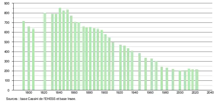 L'évolution du nombre d'habitants est connue à travers les recensements de la population effectués dans la commune depuis 1793. Pour les communes de moins de 10 000 habitants, une enquête de recensement portant sur toute la population est réalisée tous les cinq ans, les populations de référence des années intermédiaires étant quant à elles estimées par interpolation ou extrapolation[22]. Pour la commune, le premier recensement exhaustif entrant dans le cadre du nouveau dispositif a été réalisé en 2006[23].