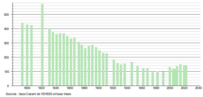 L'évolution du nombre d'habitants est connue à travers les recensements de la population effectués dans la commune depuis 1793. Pour les communes de moins de 10 000 habitants, une enquête de recensement portant sur toute la population est réalisée tous les cinq ans, les populations de référence des années intermédiaires étant quant à elles estimées par interpolation ou extrapolation[22]. Pour la commune, le premier recensement exhaustif entrant dans le cadre du nouveau dispositif a été réalisé en 2004[23].