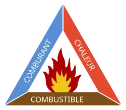 La combustion est une réaction chimique d’oxydation d’un combustible par un comburant, qui nécessite une source d’énergie. Elle met en jeu trois éléments nécessaires[1] :