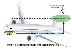 • Sur un avion à commandes de vol traditionnelles, le pilote contrôle l'avion en commandant un déplacement des gouvernes sur la base de ses sensations (vision de l'extérieur, lecture des instruments, retour d'effort dans le manche, perception des accélérations)