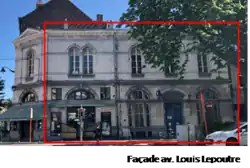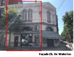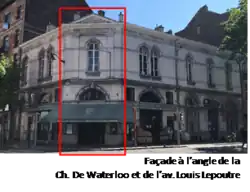 Le bâtiment se compose de sept travées. Sur la Chaussée de Waterloo, de gauche à droite, une travée d’entrée et une travée principale. Sur l’angle, la travée principale qui sert également de travée d’entrée. Celle-ci est à ressaut à l’étage et est surmontée d’un fronton purement néo-classique[b]. Sur l’avenue Lepoutre, de gauche à droite se trouve une travée principale similaire à celle de la chaussée, une travée latérale, une travée d’entrée et une travée latérale.