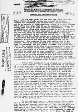 En , afin d'échapper aux Allemands à l'issue de la défaite lors de la bataille de France, les rapports des travaux français effectués au Collège de France par Frédéric et Irène Joliot-Curie, Hans von Halban et Lew Kowarski entre 1939 et 1940, sont transférés au Royaume-Uni. Dans ces rapports s'y trouvent des communications et des brevets déposés [2], dont un décrivait le principe de la bombe atomique [3].