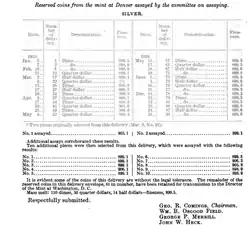La commission d'analyse de 1881 constate qu'environ 3 000 dollars en argent émis par la Monnaie de Carson City (1881-CC) ont été frappés en argent 0,892 plutôt qu'en argent 0,900, comme l'exige la loi. Il n'est pas clair si le Trésor prend des mesures pour tenter de récupérer les pièces émises. La commission de 1885 détecte un seul dollar en argent qui est à 1,51 grains (0,098 g) en dessous des spécifications, la tolérance autorisée étant de 1,50 grains[20]. En 1921, la commission d'analyse constate que certaines pièces frappées à la Monnaie de Denver ont été frappées en argent 0,905 ou 0,906, soit plus que la tolérance autorisée de 0,900. L'enquête révèle que des lingots qui ont été rejetés et qui sont destinés à être fondus ont plutôt été utilisés pour des pièces de monnaie[21]. Au début du XXe siècle, la Monnaie de San Francisco frappe des pièces en argent pour les Philippines, alors possession américaine ; ces pièces sont incluses dans l'analyse. Les pièces frappées par la Monnaie pour les collectionneurs ont été incluses dans l'analyse[22] ; les pièces frappées sous contrat avec des gouvernements étrangers ne l'ont pas été[23].