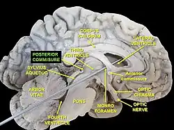 Une coupe sur le plan sagittal du cerveau humain montrant la commissure postérieure légendée au centre en haut (posterior commissure).