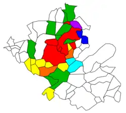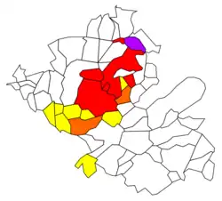 Carte des communes selon leur année d'entrée : rouge (1997), jaune (1998), orange (1999), violet (2000).
