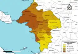 - ↑ Les densités de population sont calculées automatiquement dans un SIG en utilisant la surface géométrique de la commune, avec un niveau de précision du contour de 5 m tel qu'il ressort de l'export du découpage administratif au niveau communal (contours des communes) issu d'OpenStreetMap, et non la superficie cadastrale définie par l'Insee, qui est une donnée purement administrative. Des différences de classe peuvent ainsi éventuellement apparaître pour les communes qui se situent en limite de franchissement de seuil de classe.
