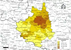 - ↑ Les densités de population sont calculées automatiquement dans un SIG en utilisant la surface géométrique de la commune, avec un niveau de précision du contour de 5 m tel qu'il ressort de l'export du découpage administratif au niveau communal (contours des communes) issu d'OpenStreetMap, et non la superficie cadastrale définie par l'Insee, qui est une donnée purement administrative. Des différences de classe peuvent ainsi éventuellement apparaître pour les communes qui se situent en limite de franchissement de seuil de classe.