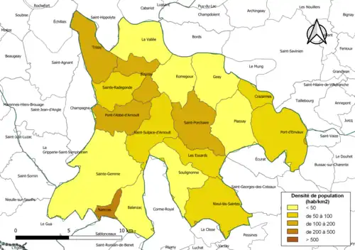 - Densité de population en 2021 : 64,6 hab/km2, (Charente-Maritime : 96,4 hab/km2).