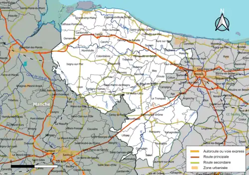 - ↑ Les communes de Trungy et Lingèvres (Communauté de communes Seulles Terre et Mer) se touchent en un point.